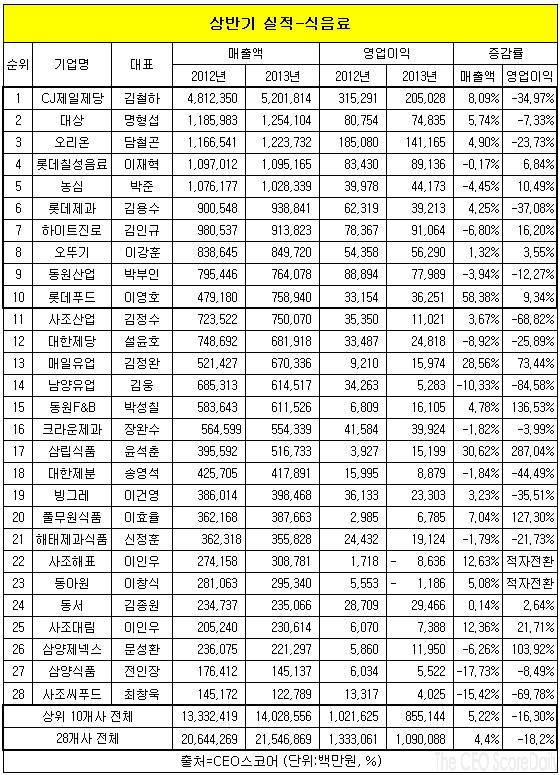 28개사 가운데 16곳은 영업이익이 줄었고, 12곳은 늘었다. CJ제일제당을 비롯한 상위 10개사의 경우 매출은 지난해 상반기 13조3천324억 원에서 올 상반기 14조285억 원으로 5.2%늘어났지만, 영업이익은 1조216억 원에서 8천551억 원으로 16.3% 줄어들었다.