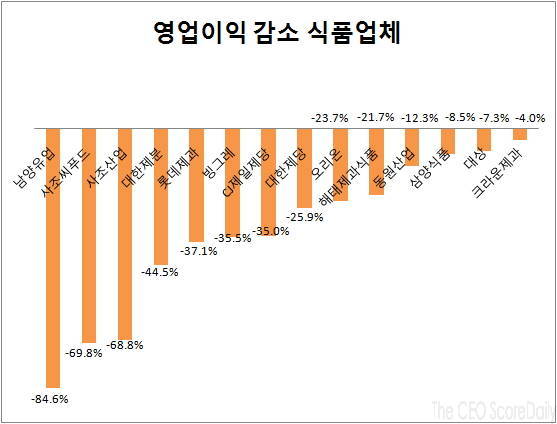 사조씨푸드에 이어 대한제분(대표 송영석)이 영업이익 감소율 44.5%를 기록했고 롯데제과(대표 김용수)는 37.1%, 빙그레(대표 이건영)는 35.5%씩 줄어들었다.