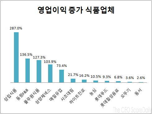 또 풀무원식품(대표 이효율)은 영업이익이 127% 늘었고, 삼양제넥스(대표 문성환)는 104% 증가했다. 매일유업(대표 김정완)과 사조대림(대표 이인우)은 매출과 영업이익 모두 두 자리 수 증가율을 기록했다.