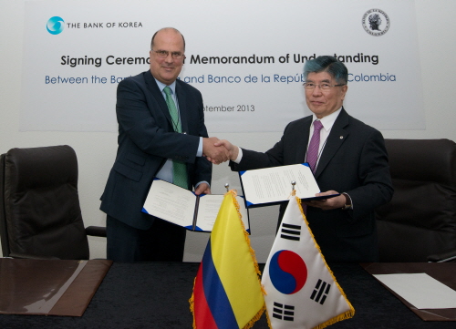 한국은행은 김중수 한은 총재가 지난 8일 José Dario Uribe E. 콜롬비아공화국(Republic of Colombia) 중앙은행 총재와 양행간 교류협력 및 기술지원에 관한 양해각서(MOU)에 서명했다고 9일 밝혔다.