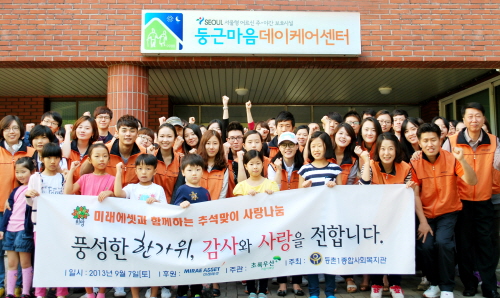 이와 함께 전 계열사 임직원들이 자발적으로 참여하고 있는 ‘미래에셋 봉사단’도 지난 8월 말부터 전국 약 65개 사회복지시설에서 이웃과 함께 민족 고유의 명절인 추석의 의미를 되새기며 나눔을 실천하고 있다.