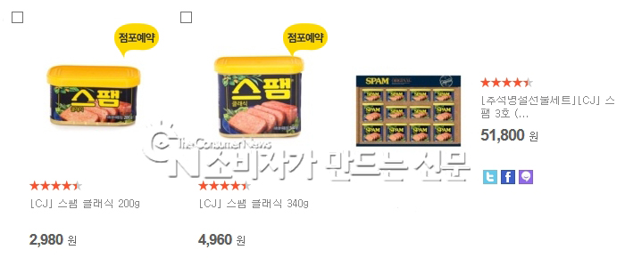 스팸 340g*6, 200g*6으로 구성돼 있는 CJ제일제당 ‘스팸 3호’ 선물세트의 가격은 5만1천800원이다. 하지만 스팸 340g의 가격은 4천960원, 200g은 2천980원으로 낱개로 구입하면 총 4만7천640원(4천960원*6+2천980*6)에 불과했다.