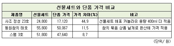 다양한 상품을 묶어놓은 선물세트가 낱개 가격의 합보다 저렴할 것이라 소비자들의 기대와 달리 실제로는 선물세트의 가격이 더 비싼 경우가 많기 때문.