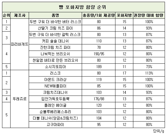 파리바게뜨와 뚜레쥬르 모두 바게트는 각각 0%,1%로 거의 포화지방이 없었고 크라상이 각각 53%, 47%로 가장 높았다. 이밖에도 단팥빵, 밤식빵, 옥수수식빵 등이 20% 이하로 비교적 낮은 제품 군에 속했다.
