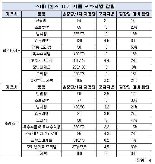 반면 단팥빵, 소보로빵, 밤식빵,슈크림빵, 크라상, 옥수수식빵, 고로케, 바게트, 모카빵, 피자빵 등 스테디셀러 10개 제품들의 포화지방은 0%~53% 미만으로 비교적 양호했다.