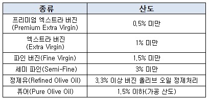 올리브유는 올리브 열매를 압착해 추출한 오일로 산화 정도 즉 산도가 낮을수록 품질을 높게 평가받는다. 산도가 1% 미만인 올리브유는 엑스트라 버진으로 고급 종류이며 0.5% 미만은 프리미엄 엑스트라 버진으로 최상품이다. 1.5% 미만은 파인 버진, 3% 미만은 세미 파인으로 구분하고 퓨어는 정제한 올리브유와 엑스트라 버진을 섞은 제품이다.