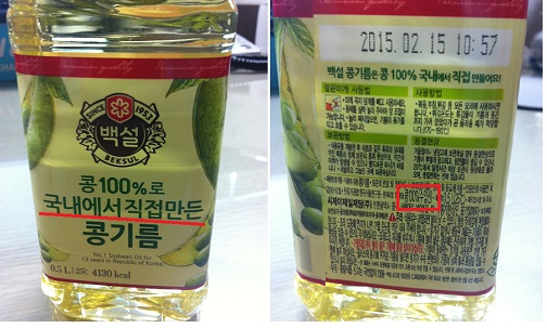 국내 대표 식품업체인 CJ 제일제당은 백설 콩기름 포장재에 ‘콩 100%로 국내에서 직접 만든 콩기름’이라고 표기되어 있다.
