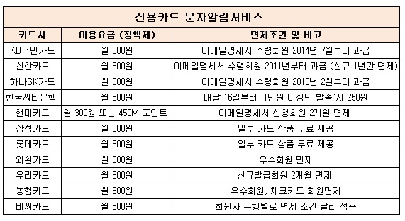KB국민카드는 이용대금명세서를 이메일로 수령하는 신용카드 고객에게 문자서비스 이용요금을 면제해줬지만 내년 7월부터는 300원씩 부과한다. 카드 신규 발급고객에게는 지난 7월 1일부터 서비스 이용료를 받고 있다.