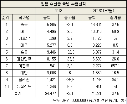 한국무협협회에 따르면 올해 일본 수산물이 가장 많이 수출된 곳은 중국(742억 엔)으로 나타났다. 지난해보다 37.5%나 증가했다. 이는 엔저 현상으로 수산물 가격이 싸지자 중국에서 수입을 많이 한 것으로 분석된다.
