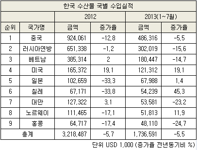 반대로 우리나라가 수산물을 가장 많이 수입해 오는 곳은 중국으로 4억 8600만 달러에 달했다. 3억 200만 달러를 수입해 오는 러시아연방이 2위를 차지했다.