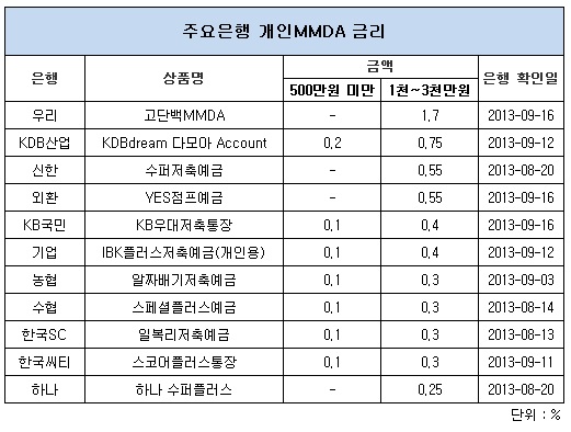 23일 소비자가 만드는 신문이 주요 은행 11곳의 개인 MMDA 금리를 비교한 결과, 잔액이 1천만원~3천만원이면 우리은행의 ‘고단백MMDA’ 상품이 금리가 1.7%로 가장 높았다.