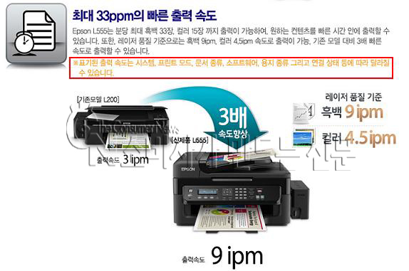 제조사 홍보책자에는 분당 흑백 33장, 컬러 15장 인쇄가 가능하고 잉크 1번 충전으로 컬러 복사 6천500장이 가능하다라고 돼 있지만 인쇄속도는 형편없이 느렸고 겨우 1천장 남짓 인쇄했음에도 잉크는 1/3밖에 남아있지 않았다.