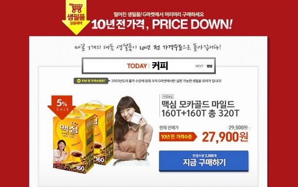 G마켓은 매일 쌀, 삼겹살, 라면, 유제품, 세제 등 대표 생필품 7종을 선정해 최대 50% 할인 판매하고, 매일 1개 품목을 이벤트 상품으로 선정하여 10년 전 가격 수준으로 선보인다.