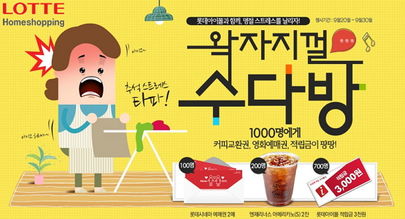 먼저 ‘수다방 설문조사’에서는 ‘이번 추석연휴, 당신을 제일 힘들게 한 것은 무엇인가요?’라는 질문에 투표하면 자동 응모 되는 이벤트와 수다방 한줄 게시판에 추석 에피소드를 공유하는 코너를 마련했다. 오는 30일까지 진행하며 행사 이벤트기간 내 구매고객에 한해 총 1천 명에게 커피교환권, 영화예매권, 롯데아이몰 적립금을 지급한다.