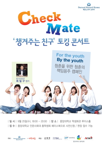지난 5월 서울시립대에 이어 두 번째로 중앙대학교 총학생회가 캠페인 동참을 약속하며 공동주최인 대학내일과 영리더스클럽(YLC)와 성공적인 캠페인 확산을 위한 협약식을 진행한다. ‘체크-메이트 캠페인’은 페르노리카 코리아가 대학생을 대상으로 무분별한 음주를 방지하고 책임음주를 장려하기 위한 사회공헌활동의 일환으로 올해 5월 서울시립대에서 공식 론칭했다.
