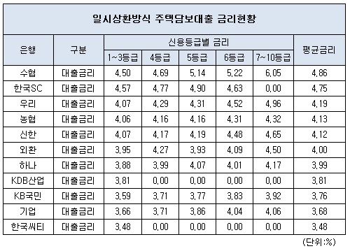 일시상환방식 주택담보대출 평균금리가 가장 낮은 곳은 한국씨티은행(3.48%)이지만 KDB산업은행과 마찬가지로 1~3등급 고객만 취급해 평균 금리는 별 의미가 없다.