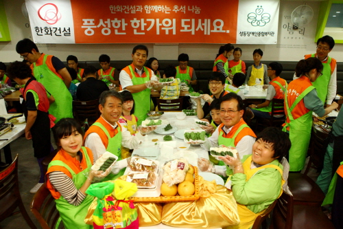 성동 장애인 종합복지관에서 진행된 이날 행사에는 한화건설 이근포 사장을 비롯해 임직원 50여명이 참석, 송편과 절편 등 추석음식을 만들어 인근 50여 가구 소외계층에 전달했다.