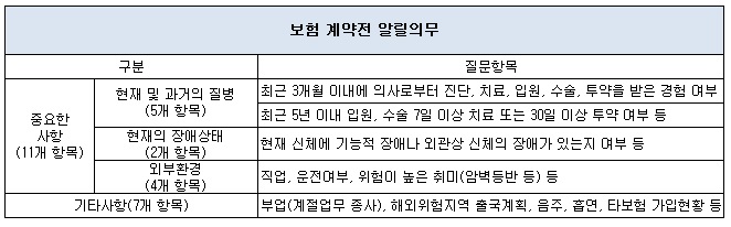 금융감독원 관계자는 “계약전 알릴의무를 위반할 경우 보험계약이 해지되거나 보장이 제한되는 등 불이익을 받을 수 있다”며 “단, 고의 또는 중대한 과실로 고지의무를 위반했더라도 보험계약 후 3년이 지나면 보험계약이 해지되지 않는다”고 설명했다.