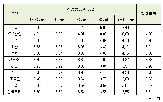 신용등급별로 살펴봐도 수협은 대출을 취급하지 않은 1~3등급을 제외한 모든 등급에서 타 은행보다 금리가 높았다. 특히 7~10등급의 저신용등급자들에 7.48%의 금리를 물려 3~4%대인 다른 은행보다 2배 수준이었다.