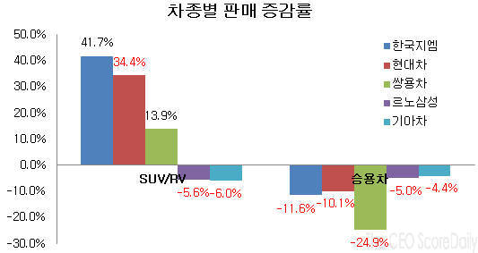 기아차는 0.7%포인트, 한국지엠은 9.2%포인트, 쌍용차는 3%포인트 하락했다. 르노삼성은 유일하게 0.1%포인트 올랐다. SUV 및 RV 판매 비중은 한국지엠이 6%포인트 가장 크게 올랐으며, 현대차가 5.4%포인트, 쌍용차가 3%포인트 상승했다.