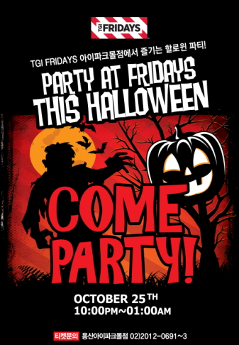 서울 용산의 TGI프라이데이스 아이파크몰점에서 저녁 10시부터 1시까지 80명 대상으로 열리는 파티에서는 칵테일 두 잔과 핑거푸드가 기본으로 제공된다. TGI프라이데이스의 전문 바텐더들이 펼치는 칵테일 쇼는 물론 비트박스, 댄스 공연과 함께 베스트드레서 선정 등 다채로운 프로그램 등으로 오싹하고 즐거운 할로윈 분위기를 즐길 수 있다.