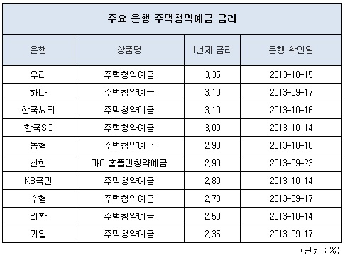 주택청약예금 금리가 가장 높은 곳은 우리은행으로 3.35%의 금리를 주고 있다.
