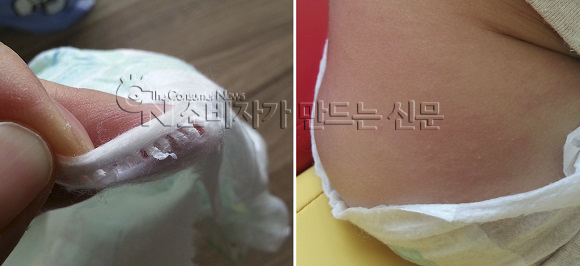 기저귀를 갈면서 뒤늦게 아이 옆구리에 오돌토돌 벌겋게 발진이 올라온 것을 보고 깜짝 놀란 오 씨. 그제야 기저귀를 살폈고 허리밴드의 솔기부분이 플라스틱처럼 딱딱하게 삐져나와 있는 것을 발견했다.