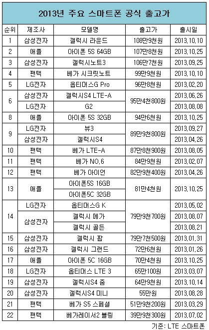 지난해와 달리 50~60만원대 중저가 스마트폰이 5개나 등장한 점도 눈길을 끈다. 삼성전자 '갤럭시S4 미니'(출고가 55만원)을 비롯해 LG전자 '옵티머스 LTE 3'(출고가 65만100원), 팬택의 '베가 S5 스페셜'(출고가 51만9천200원)등 3개사 제품이 자리잡았다.