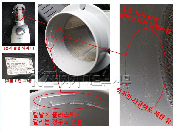 여느날과 다름없이 과일주스를 만들고 믹서기의 필터를 씻다 이 씨의 아내는 이상한 점을 발견했다. 필터 안쪽이 눈에도 뚜렷히 드러날만큼 날카로운 물체에 갈려있었던 것. 그동안 믹서기로 갈았던 것은 물렁물렁한 포도 뿐이어서 칼날에 플라스틱 필터까지 갈려 플라스틱 가루를 먹어왔다는 사실을 확신하게된 이 씨부부.