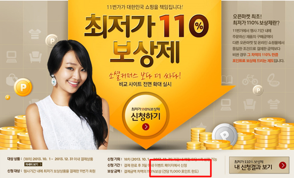 오픈마켓 측이 내세운 최저가 보상제의 적용 금액에 한도가 있는 것으로 확인됐다. '차액 110% 포인트 보상'이라고 전면에 내세운 내용과 달리 금액 한도는 눈에 안띄는 별도 조항으로 기재되어 있었다.