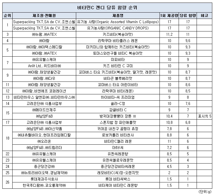 고려은단 식품사업부의 ‘쏠라-C정’ 7.6g, 메이드인제주의 ‘감귤비타 C’와 남양F&B의 ‘방귀대장뿡뿡이 장튼 Ⅲ’가 7g였다. 방귀대장뿡뿡이 장튼 Ⅲ 제품의 경우 제품 상에는 1회 제공량당 당류를 5g으로 잘못 기재해 두고 있었다.