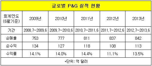 지난 2009년 P&G는 매출액 753억 달러(80조)를 기록했고, 매년 증가세를 보이다 지난 2013년에는 842억 달러(89조)로 5년 전에 비해 매출액이 10%이상 늘어난 것으로 조사됐다.
