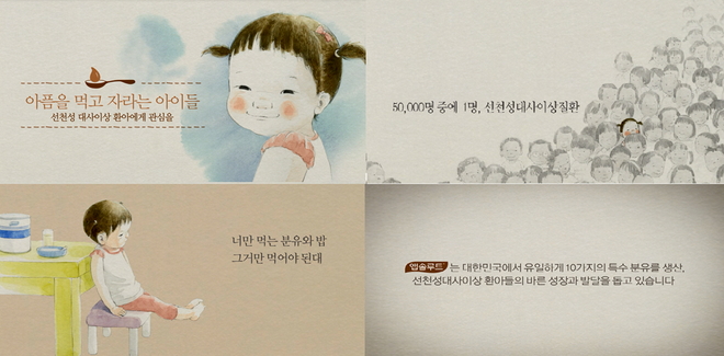 5만명 중 한 명꼴로 발생하는 선천성 대사이상 질환은 태어난 순간부터 아미노산, 지방 등 필수 영양소를 분해하는 특정 효소가 체내에서 생성되지 않아 모유는 물론 밥이나 고기 등의 음식을 마음대로 먹지 못하고 남들과 다르다는 시선 속에서 평생 고통과 아픔을 감수한 채 살아가야 한다. 이 동영상은 바로 이런 아픔을 겪고 있는 선천성 대사이상 환아와 엄마의 사연을 가슴 뭉클한 그림 동화로 제작한 것.