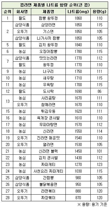 2위는 1천850mg인 삼양식품의 ‘삼양라면’ ‘나가사끼 짬뽕’ 오뚜기의 ‘기스면’이 차지했고 팔도의 ‘김치 왕뚜껑’은 1천840mg으로 5위를 기록했다.