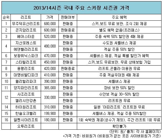 뒤를 이어 현재 판매 종료된 곤지암리조트(한정 판매 3천400매)가 60만 원으로 2위에 올랐고 4일부터 11월 판매분을 판매하기 시작한 베어스타운이 52만 원으로 3위를 차지했다.