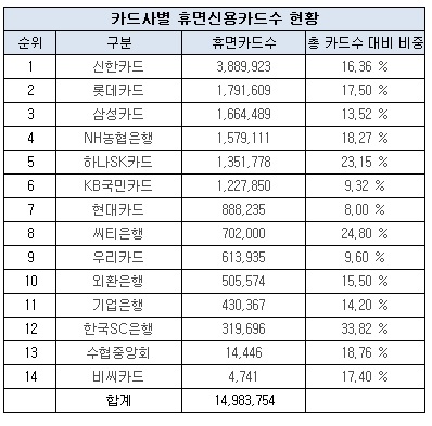 이어 현대카드가 88만8천235장의 휴면카드를 보유해 7위를 차지했고 한국씨티은행은 70만2천 장, 우리카드 61만3천935장, 외환은행 50만5천574장, 기업은행 43만367장, 한국SC은행 31만9천696장, 수협중앙회 1만4천446장 등의 순이었다. 비씨카드는 4천741장으로 가장 적었다.