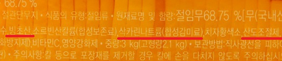 김밥에 빼놓을 수 없는 단무지의 새콤달콤한 맛을 살리기 위해서는 첨가물로 사카린나트륨과 빙초산 등이 사용된다. 발암 물질로 지목되던 사카린은 근래 들어 무해하다는 연구결과가 속속 발표되고 있지만 소비자 불안감은 여전하다. 섭취하기 전 단무지를 찬물에 5분 정도 담가두면 사카린나트륨 대부분 제거할 수 있다.