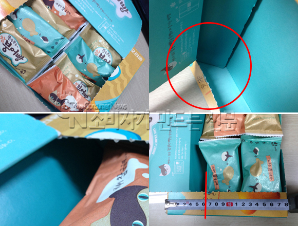 오리온 ‘참붕어빵’의 경우 종이 박스의 길이는 18cm에 달했지만 종이벽을 포함해 제품이 들어있지 않은 공간은 약 6cm(33%)에 근접했다. 각 모서리와 제품 사이사이에 존재하는 빈공간까지 계산할 경우 비율은 더욱 커지는 셈이다.