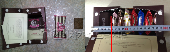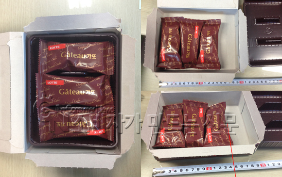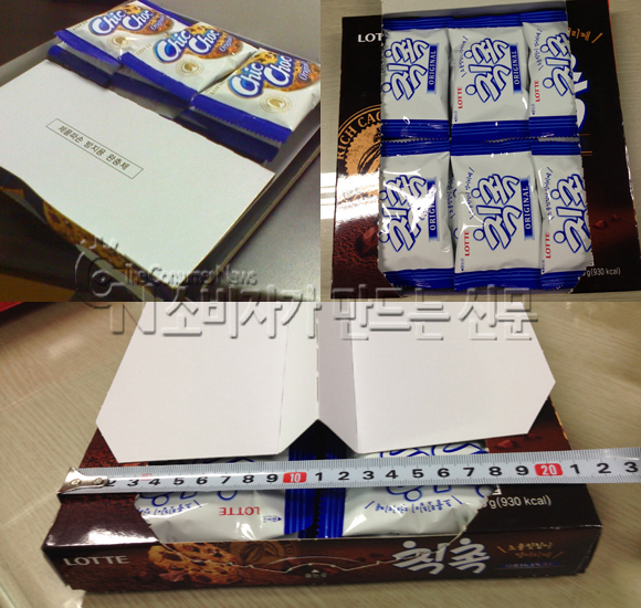 하지만 롯데제과 ‘가토 쇼콜라’는 트레이를 제거하자 빈 공간이 드러났다. 총 길이 18.5cm 중 빈 공간은 4cm로 빈 공간 비율은 21.6%인 것으로 나타났다.