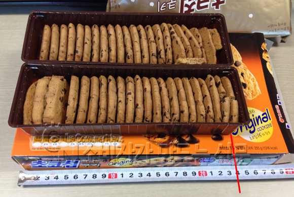 오리온 '마켓오 리얼브라우니(140g)'도 전체 길이 19.5cm 중 과자 7개를 제외한 빈 공간의 길이가 5.5cm(28%)였으며, 두 개의 트레이로 구성된 오리온 ‘초코칩 쿠키’ 역시 총 길이 18.5cm 중 약 4.5cm가 빈 공간이었다. 양 옆의 빈공간을 계산하지 않더라도 빈 공간의 비율이 24%가 넘는 셈이다.