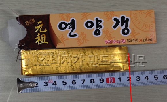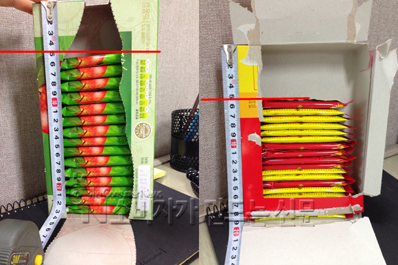 해태제과 연양갱은 상자 속에 빈 공간이 많아 내용물이 움직이는 소리마저 났다. 총 길이 15cm 중 제품은 12cm. 길이로 계산했을 때 딱 20%였지만 내용물의 두께나 폭 역시 포장 상자와 차이가 많이 나 실제 빈 공간은 20%를 상회하는 것으로 추정된다.