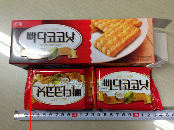 반면 과거 거대한 제품파손 방지용 완충재를 넣어 소비자로부터 과대 포장이라는 지적을 받았던 롯데 ‘칙촉’은 포장 용기를 대폭 줄였다. 다만 여전히 완충용으로 들어간 종이로 인해 총 길이 21cm 중 3cm(14.2%)의 빈 공간이 생겼다. 롯데제과의 ‘빠다코코낫’ 역시 총 22cm 중 빈 공간은 3cm(13.6%)에 불과했다. 모두 환경부 기준치 이하로 양호했다.