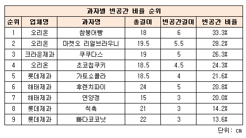 크라운해태제과 제품도 오리온보다는 양호했으나 20% 비율을 다소 웃돌았다. 해태 ‘후렌치파이’는 24cm 중 약 5cm(20.8%)가 넘는 빈 공간이 존재했으며, 크라운 ‘쿠쿠다스’는 19cm 중 5cm(26.3%)에 달했다.