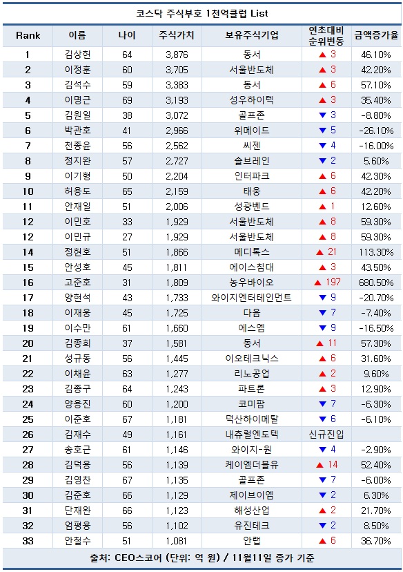 13일 기업 경영성과 평가사이트인 CEO스코어(대표 박주근)가 국내 코스닥 상장사 중 시가총액 상위 500개사의 대주주와 특수관계인, 5%이상 지분 보유자 2천771명의 보유지분가치(11월11일 종가 기준)를 조사한 결과, 보유 주식가치가 1천억 원을 넘는 부호가 33명에 이르는 것으로 나타났다.