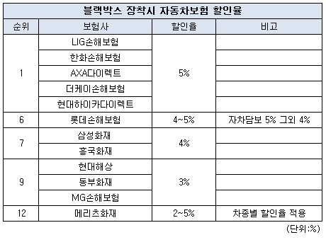 손해보험사들은 2009년 4월부터 자동차보험 가입자가 차량에 블랙박스를 설치하면 보험료를 할인해 주고 있다. 2011년 1~2%에서 지난해 최대 5%로 늘어났던 블랙박스 할인율은 올 들어 축소되는 움직임을 보이고 있었다.
