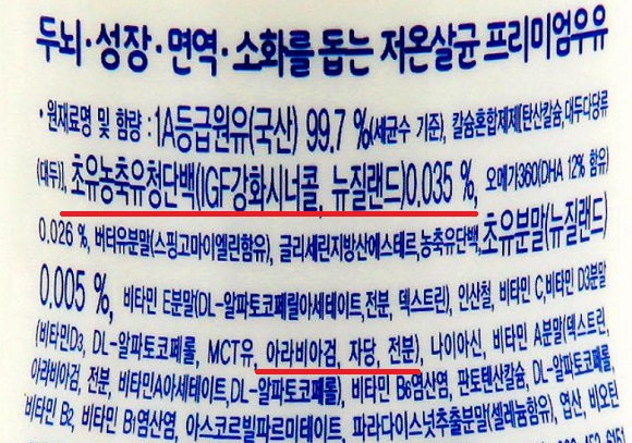 서울우유 ‘앙팡베이비’나 일동후디스 ‘초유 넣은 베이비우유’도 원유비중이 99.7%에 달한다. 다른 보강 영양성분 함량이 미미하지만 자당 변성전분 말토덱스트린 아라바이검 등 첨가물은 상당수 더해진다.