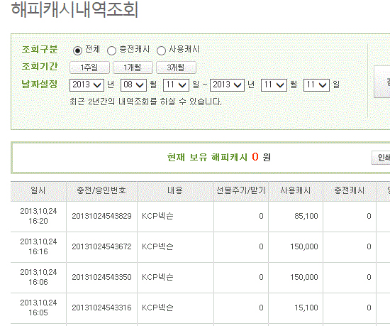 인터넷 쇼핑몰, 공연 티켓, 모바일 기프티콘 등에서 손쉽게 사용할 수 있어 일부러 충전시켜놨던 캐시 40만200원이 모조리 사라져 버렸기 때문. 단 몇 분 사이에 모 게임 사이트로 수십만 원이 홀랑 빠져나가 버린 것을 알 수 있었다.