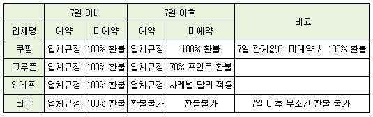 위메프와 그루폰은 7일이 지나더라도 쿠폰 발행 업체가 제시한 취소 수수료를 내면 환불이 가능하다고 설명했다. 예약을 하지 않았을 때 그루폰은 '미사용쿠폰환불제'를 적용하고 있다. 하지만 위메프는 '사례별로 환불 기준을 달리 적용'하고 있는데 이 부분이 구매자들의 혼란을 부추긴다는 지적이다.