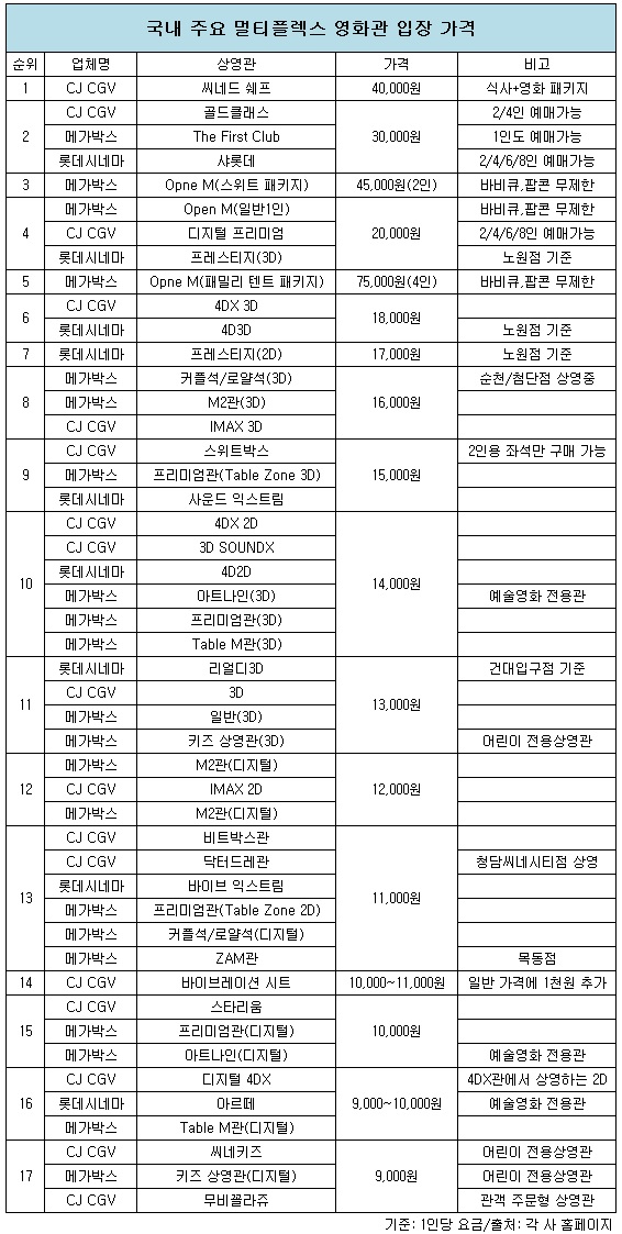 CJ CGV의 '씨네 드 쉐프'가 4만 원으로 1위를 차지한데 이어 안락한 의자와 간식거리가 제공되는 CJ CGV '골드클래스', 메가박스 'The First Club', 롯데시네마의 '샤롯데'가 주말 성인요금 기준 3만 원으로 공동 2위에 올랐다.
