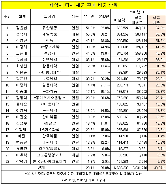이 때문에 LG생명과학의 자사 제품 판매를 의미하는 제품판매 비중은 지난 2011년 74%에서 올해 3분기 82.3%로 8.2%나 상승했다. 이어 녹십자(대표 조순태)가 4.3%P, 한미약품(대표 이관순) 3.5%P, 대원제약(대표 백승열)과 보령제약(대표 김은선), 코오롱생명과학(대표 이우석), 이연제약(대표 유성락)은 2%P 미만으로 하락했다. 상품매출 비중 자체가 가장 높은 회사는 유한양행에 이었으며 이어 제일약품이 59.9%를 기록했다 제일약품은 고지혈증치료제인 ‘리피토’ 등 주로 한국화이자 상품의 대행판매를 하고 있다.